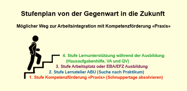 Unsere modulartigen Dienstleistungen geben Spielraum für individuelle Lösungen und bilden das Fundament weiterer Fördermassnahmen der SSAW (z.B. Lernatelier mit Praktikumssuche) sowie für die berufliche Ausbildung (z.B. Lehre EBA/EFZ) im Sinne eines Stufenmodells.