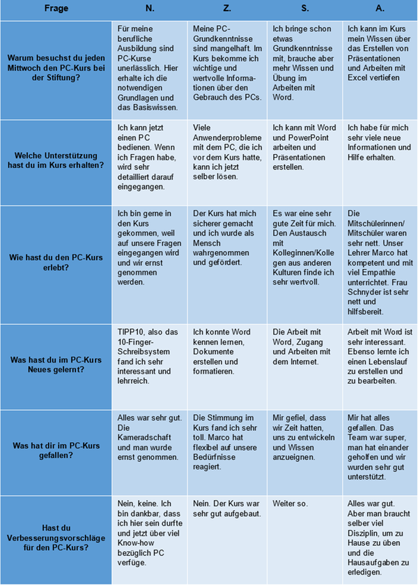 Die selbst entwickelten Kurse vermitteln unseren Teilnehmerinnen und Teilnehmern grundlegende Kompetenzen in praxisorientierten Lerneinheiten. Schwerpunkte sind allgemeiner und berufsbezogener Unterricht, das Bewerbungsdossier, die Stellen- oder Praktikumssuche, sowie die Anwendung von Computer und Internet als Hilfsmittel zur erfolgreichen Bewältigung des digitalen Alltags.